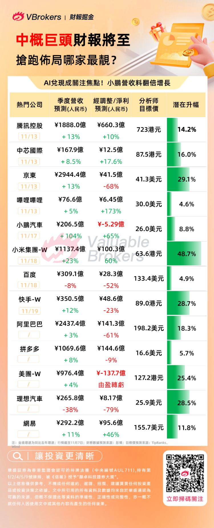 小米集团-W方面,虽然股价近期遭遇短期逆风,但得益于Q3智能手机恢复正增长且电动车交付量持续提升,业绩依旧保持高增长;预计Q3总收入及经调整净利润将实现同比分别增长22%及60%,达1137亿及100亿元。投资者重点关注小米第二座电动车工厂获批投产,将成为推升股价重估的催化剂。