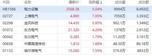 华盛资讯11月06日讯,港股早盘电力设备股普涨,上海电气大涨7%,金风科技涨近6%,东方电气涨超4%,哈尔滨电气、东北电气涨超1%。