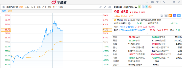 华盛资讯11月06日讯,截至发稿,小鹏汽车-W转涨超3%,报90.45港元,成交额31.24亿港元,日内一度跌逾5%。