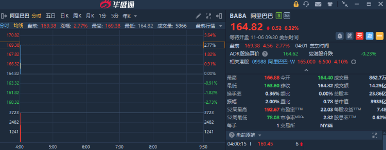 阿里巴巴盘前涨近3%;消息面上,阿里港股收盘涨逾4%,淘宝闪购新客双11电商订单破亿。