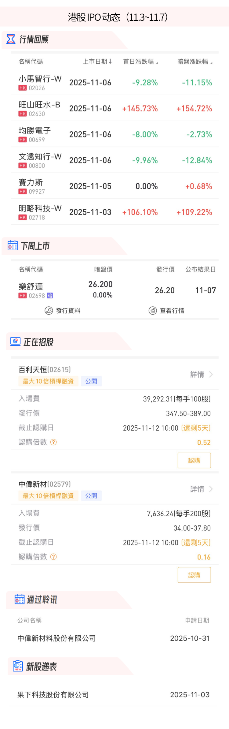 公司拟全球发售1.04亿股股份,其中香港公开发售占10%,国际发售占90%,另有15%超额配股权,获基石认购2.14亿美元;每股发售价34-37.8港元,每手200股,一手入场费7636.24港元。截至发稿,孖展认购倍数达1.95倍。公司是锂离子电池用镍系和钴系正极活性材料前驱体(pCAM)的全球领导者,自2020年起连续五年出货量排名第一。截至2024年及2025年6月30日止六个月,公司收入由200.86亿元增加至213.23亿元。中伟新材将于下周五(11月14日)暗盘。