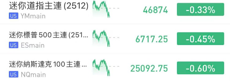 美股三大指数期货盘前走弱,纳指期货 $NQmain 跌0.6%,标普500期货 $ESmain 跌0.45%,道指期货 $YMmain 跌0.33%。