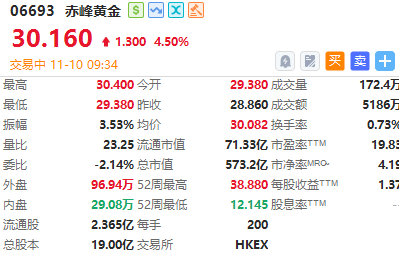 华盛资讯11月10日讯,港股黄金股盘初走高!截至发稿,赤峰黄金涨超4%,山东黄金涨超3%,招金矿业涨超2%,紫金黄金国际涨超1%。