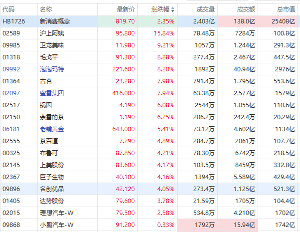 华盛资讯11月10日讯,港股午后,新消费概念股强势拉升!沪上阿姨大涨超15%,卫龙美味、毛戈平、泡泡玛特、蜜雪集团涨约8%,古茗涨超7%,老铺黄金、茶百道涨约5%