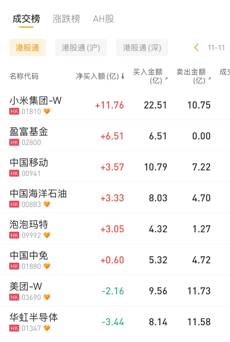 小米集团-W、盈富基金 、中国移动分别获净买入11.76亿港元、6.51亿港元、3.57亿港元;