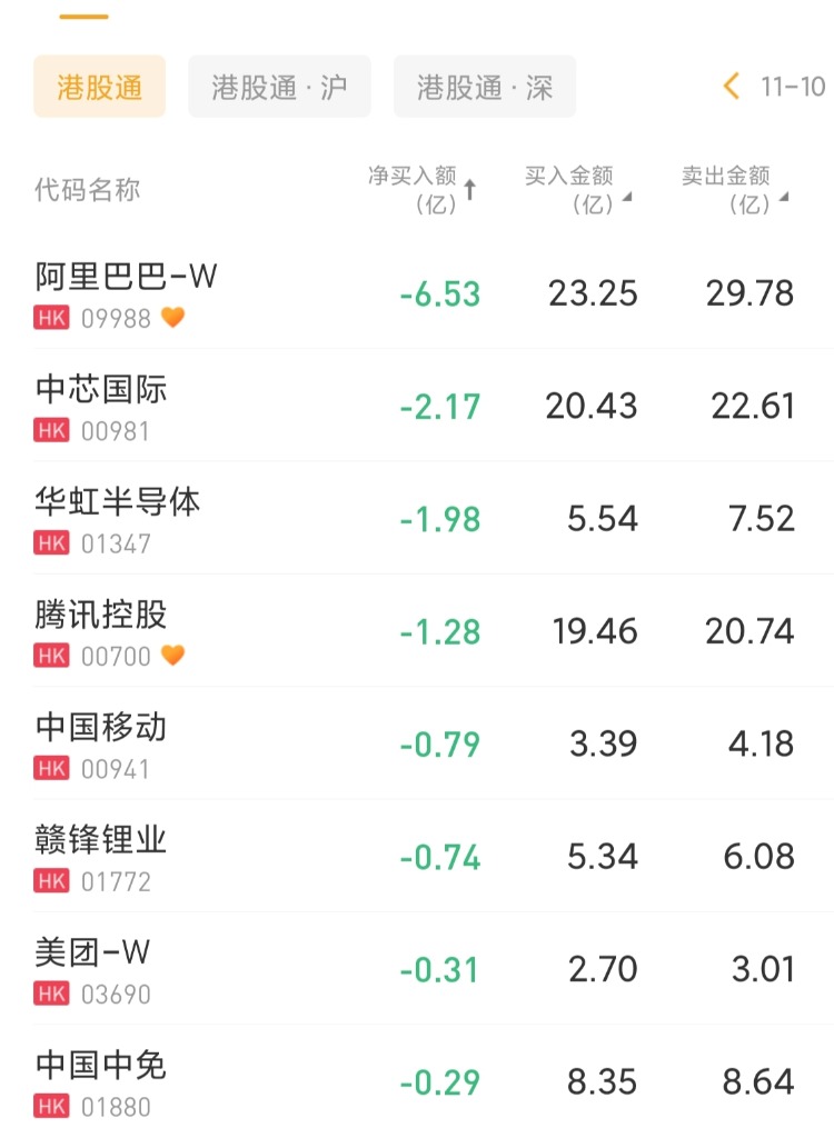 阿里巴巴-W、中芯国际、华虹半导体分别遭净卖出6.53亿港元、2.17亿港元、1.98亿港元。