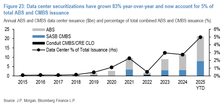 (数据中心相关证券化产品的规模同比增长了83%,目前在ABS及CMBS总发行量中所占的比例为5%)