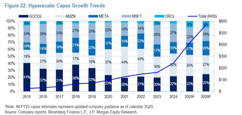 大型科技公司这些公司每年产生超过7000亿美元的运营现金流,其中约5000亿美元被再投资于资本开支。摩根大通假设,其中每年约有3000亿美元的现金流将直接用于AI和数据中心的投资。
