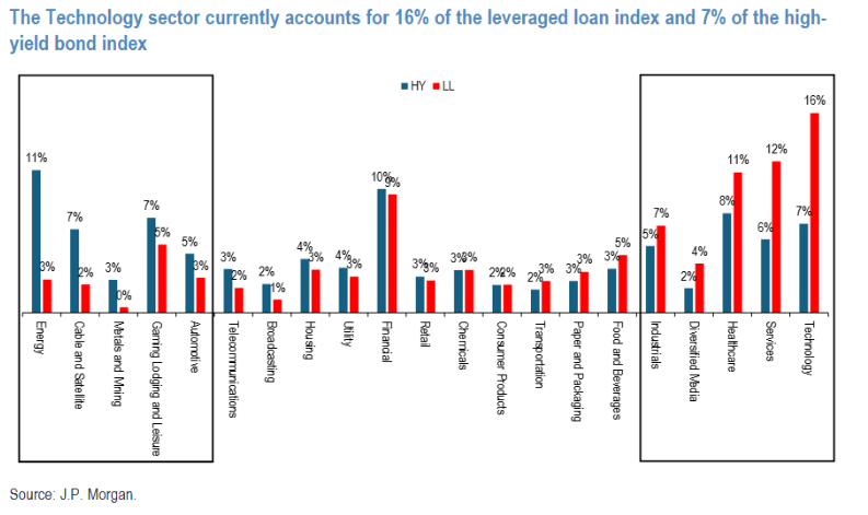 (目前科技行业在杠杆贷款指数中的占比为16%,在高收益债券指数中的占比则为7%。)