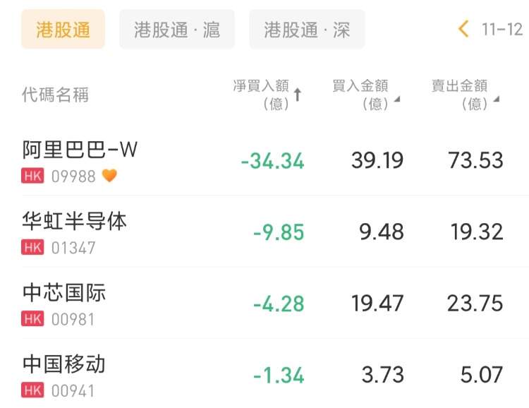 阿里巴巴-W、华虹半导体、中芯国际分别遭净卖出34.34亿港元、9.85亿港元、4.28亿港元。