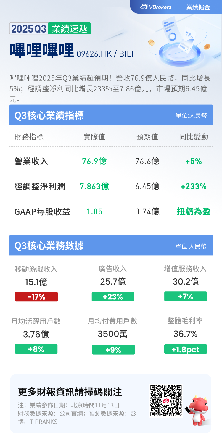 - 哔哩哔哩Q3实现营收76.9亿元,同比增加5%,市场预期76.6亿元。