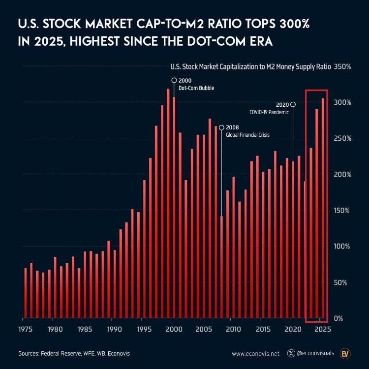 以Econovis提供数据来看,美股总市值与M2的比值已经超过300%。该指标通常用来衡量市场的“货币化”程度和相对估值水平,高比例通常意味着央行释放大量流动性(M2)流入了金融市场(尤其是股市),推高了资产价格,导致股市估值相当于社会总货币信用偏高。