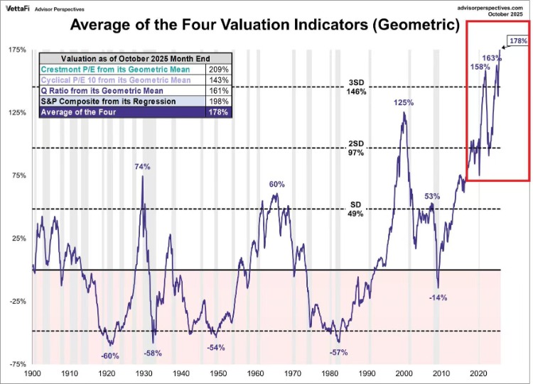 当然,只看单一指标就下结论说美股太贵,肯定是不够全面的。基于此,有分析师为了探讨当前美股的估值,特意将席勒市盈率(Cyclical P/E)、Crestmont市盈率、Q比例、标普综合指数回归这四个重要估值指标进行计算,并取其平均值。结果发现,当前美股的四大估值指标平均值竟然高达178%,远超2000年互联网泡沫时125%的前历史记录!