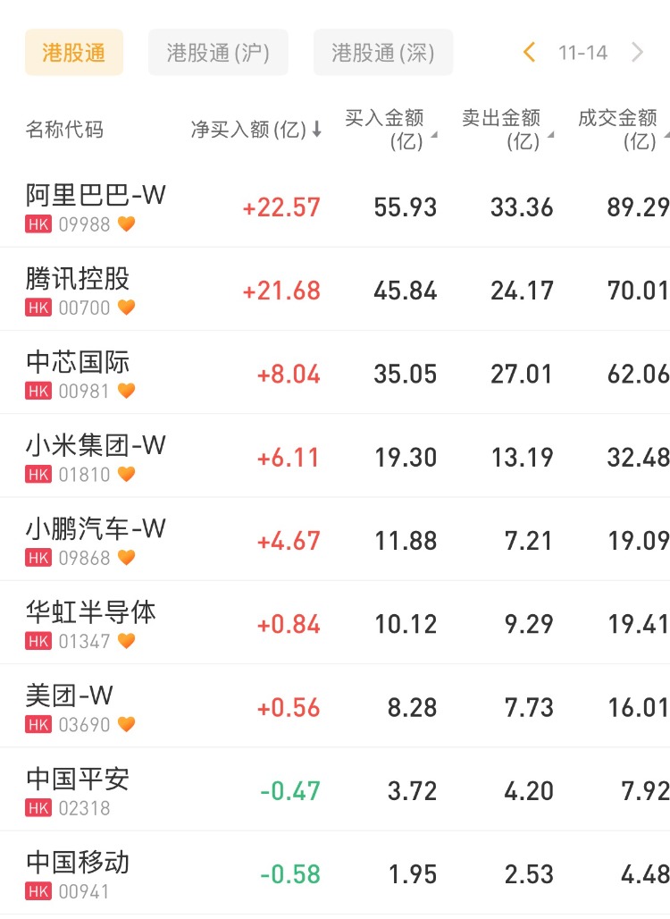 阿里巴巴-W、腾讯控股、中芯国际分别获净买入22.57亿港元、21.68亿港元、8.04亿港元;