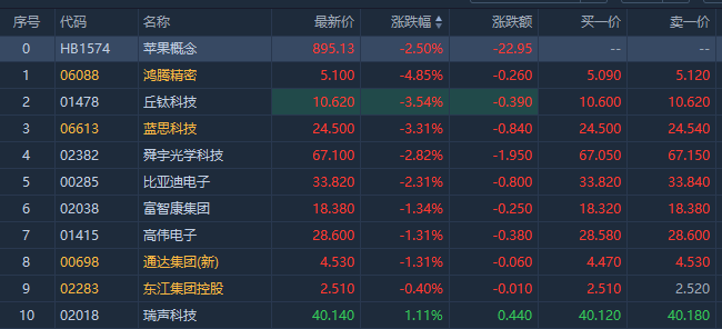 华盛资讯11月17日讯,苹果概念股集体走低,截至发稿,鸿腾精密跌近5%,丘钛科技跌3.54%,蓝思科技跌超3%,舜宇光学科技跌近3%,比亚迪电子跌2.31%,高伟电子跌1.31%。