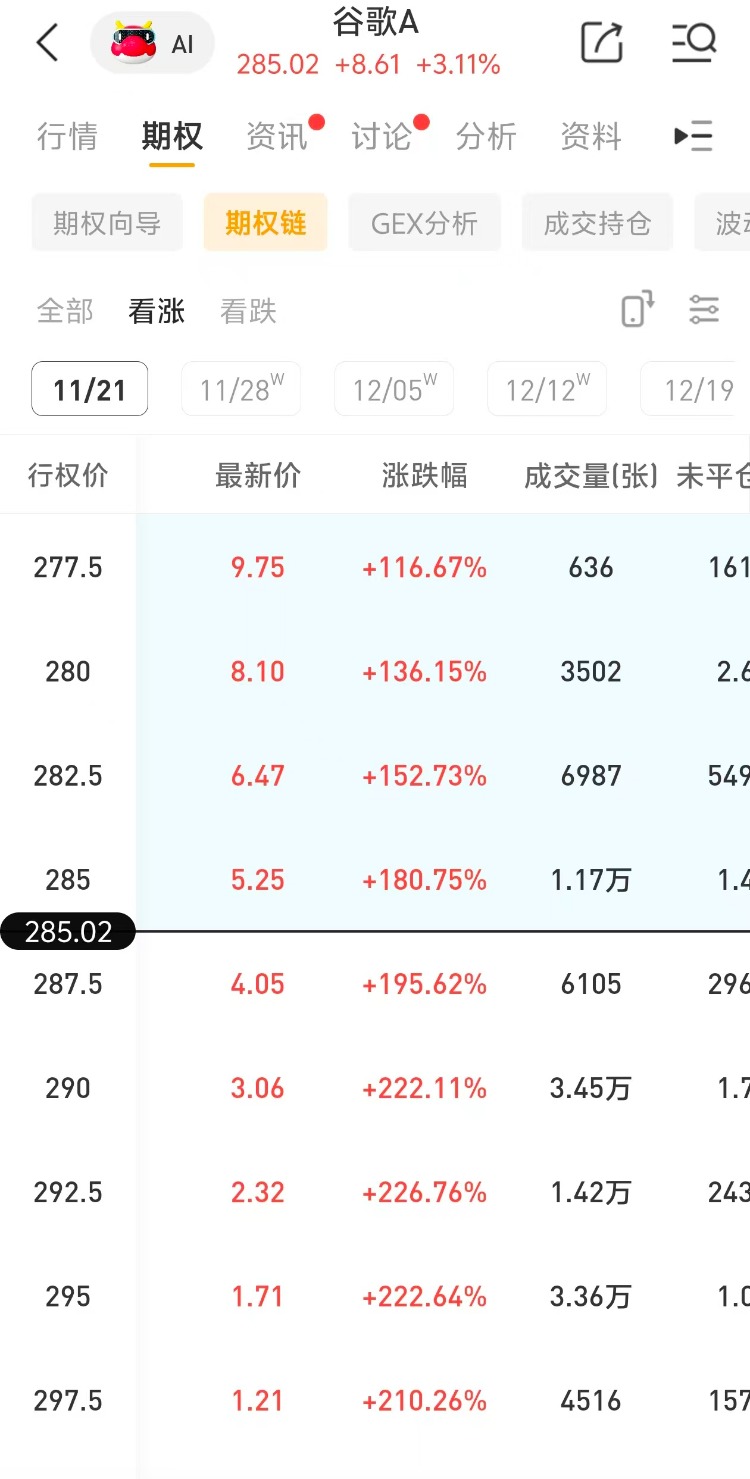 谷歌A:隔夜涨3.11%,当日期权成交总量达62万张,较前一日增加21.58万张,环比前一日放量0.54倍。其中看涨期权占比约70%,看跌期权占比30%。未平仓量有354万张。11月21日到期看涨期权多上涨超100%。期权链:谷歌A GOOGL 期权链