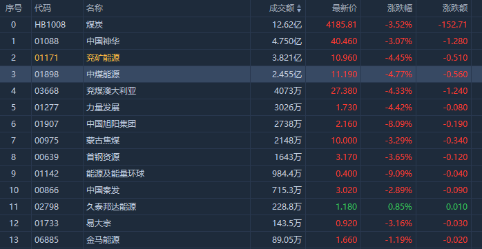 华盛资讯11月18日讯,煤炭股集体走低,截至发稿,中煤能源跌4.77%、兖矿能源跌4.45%、兖煤澳洲跌4.33%,中国神华跌3.07%。