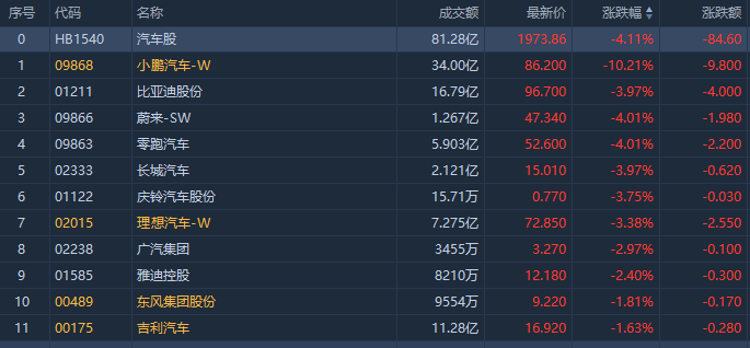 华盛资讯11月18日讯,汽车股普遍走弱,截止发稿,小鹏汽车-W跌超10%、零跑汽车、长城汽车跌4%、长城汽车、比亚迪股份跌近4%、理想汽车跌超3%。