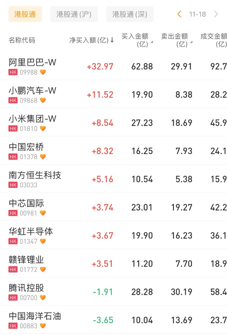 阿里巴巴-W、小鹏汽车、小米集团分别获净买入32.97亿港元、11.52亿港元、8.54亿港元。