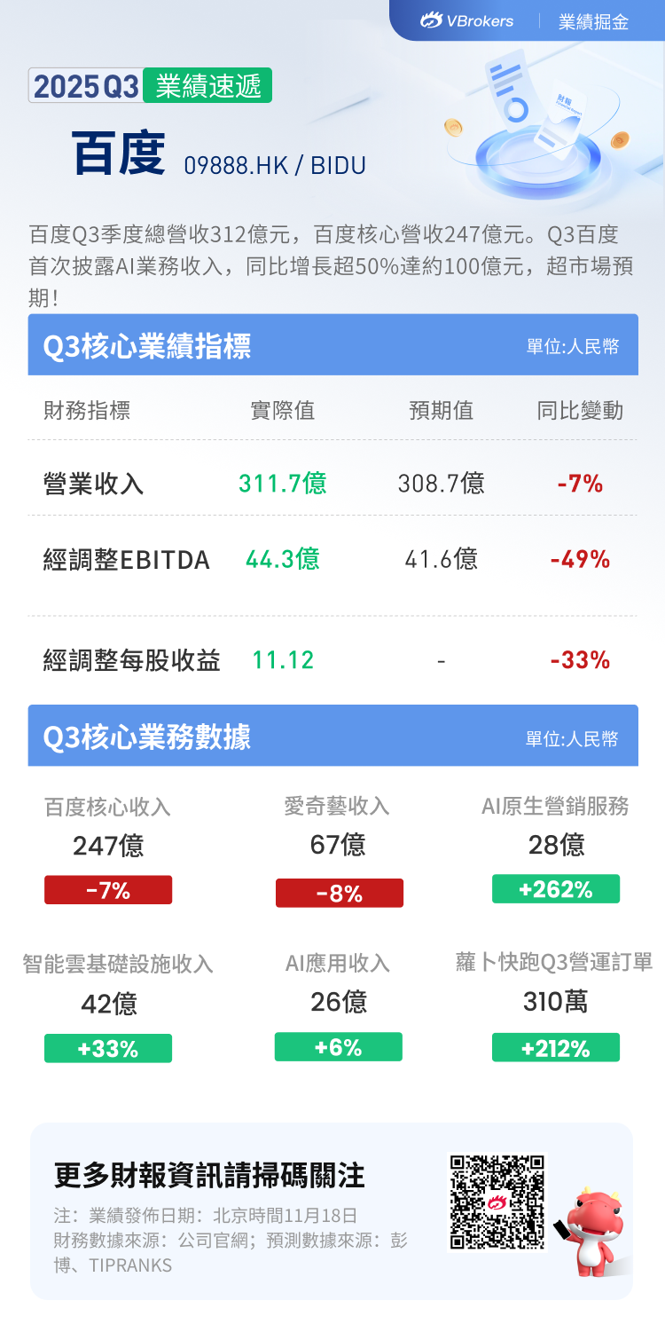 华盛资讯11月18日消息,百度 $09888.HK / $BIDU 今日公布截至2025年9月30日止的三季度业绩。