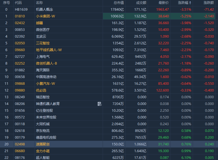 华盛资讯11月19日讯,机器人概念股走势分化,截至发稿,越疆跌近4%,三花智控、地平线机器人-W跌超2%,优必选跌0.33%,速腾聚创跌涨0.76%。