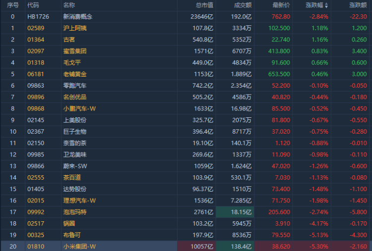 华盛资讯11月19日讯,新消费概念股涨跌不一,截至发稿,沪上阿姨、古茗涨超1%,蜜雪集团涨0.83%,毛戈平涨0.66%,老铺黄金涨0.46%,布鲁可跌超5%,泡泡玛特跌超2%.