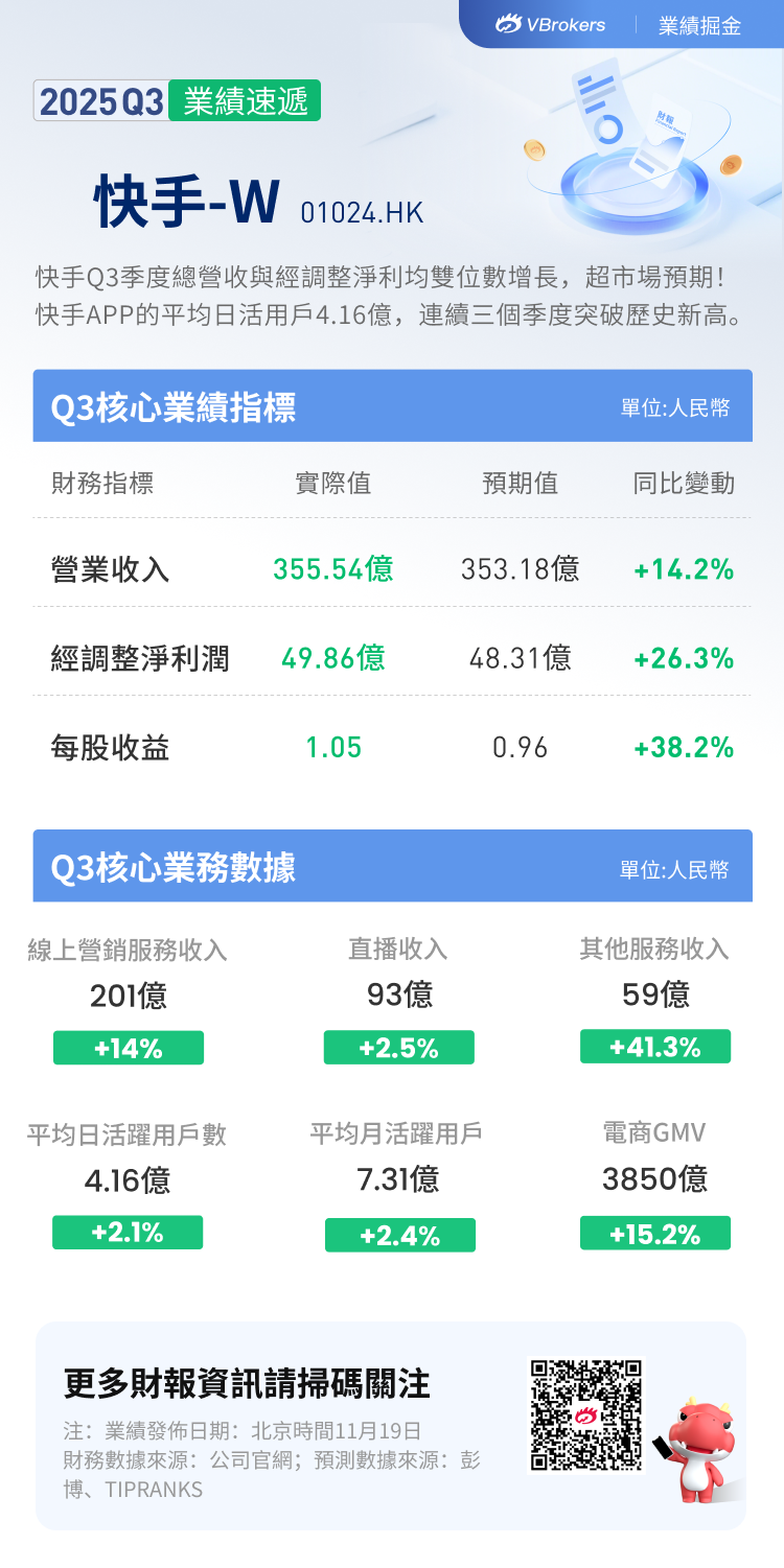 华盛资讯11月19日消息,快手-W公布截至2025年9月30日止的三季度业绩。