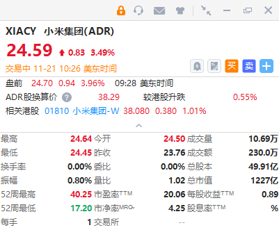 华盛资讯11月21日讯,小米集团ADR $XIACY 止跌回升,涨约3.5%,公司开启大额股份回购,两日斥资逾8亿港元;