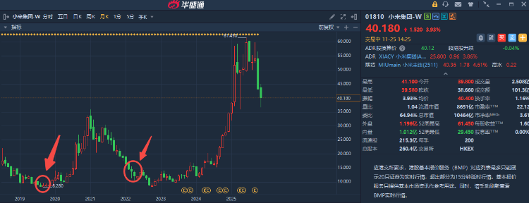 历史上,小米曾两次公布大规模回购计划。第一次回购推出的时间为2019年9月3日,彼时公司股价持续走弱,一度跌至8.3港元;随后,公司宣布推出120亿港元回购计划,股价在继续盘整后开始持续回升,最终在2021年“牛市”中创下35.9港元的阶段高点。若投资者在小米股价触及8.3港元并宣布回购之时买入,浮盈或超300%!