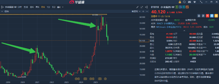 华盛资讯11月25日讯,今日,小米集团-W股价展开强劲反弹,股价一度大涨逾6%,一举收复40港元大关。截至发稿,小米涨幅略微回落,但仍稳在40港元上方。