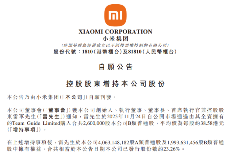 11月25日,针对前日雷军个人斥资增持公司股份的消息,花旗发表报告表示,小米创办人雷军于昨日增持股份,按每股平均38.58港元的价格,购入共260万股B类普通股,完成此次增持后,雷军对小米的持股比例上升至23.26%。该行认为雷军增持小米股份消息属正面,并给予小米集团-W“买入”评级及目标价50港元。