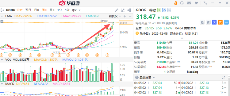 华盛资讯11月25日讯,得益于Gemini 3、TPU芯片、巴菲特建仓等多重利好加持,谷歌连日暴涨,周一再涨超6%,创历史新高,公司市值逼近4万亿美元。