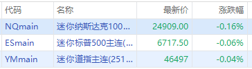 周二盘前,三大股指期货盘前齐跌,截至发稿,纳指期货 $NQmain 跌0.16%,标普500期货 $ESmain 跌0.06%,道指期货 $YMmain 跌0.04%。