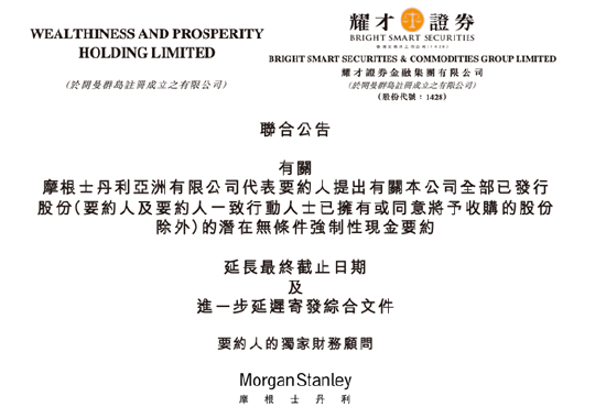 踩在截止日上,蚂蚁集团全资控股公司WEALTHINESS AND PROSPERITY HOLDING LIMITED与香港本地券商耀才证券 (1428.HK)宣布,收购要约时间延长4个月,原定交易最终截止日为2025年11月25日,现时最终截止日期延长至2026年3月25日;另外,蚂蚁加付按金的数额由1.4亿港币(占销售股份总代价的5%),更改为1.6亿港币,约占销售股份总代价约5.83%。