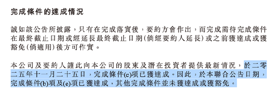 公告显示,双方目前已达成(b)项及(e)项条件,其他完成条件并未获达成或获豁免。