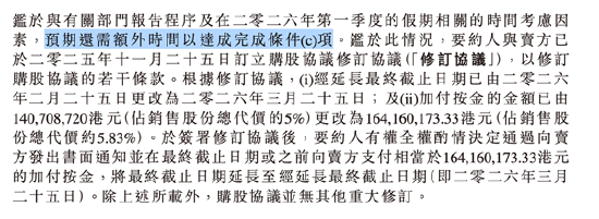 这是无法豁免的关键条件,也是交易延期的主要原因。公告表示,鉴于与有关部门报告程序及在2026年第一季度的假期相关的时间考虑因素,预期还需额外时间以达成完成条件。
