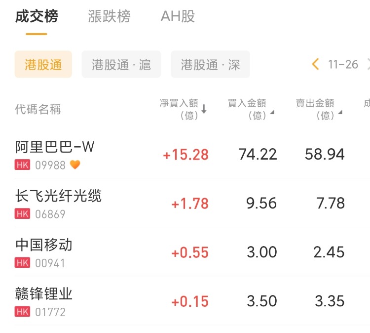 阿里巴巴-W、长飞光纤光缆、中国移动分别获净买入15.28亿港元、1.78亿港元、5452万港元。