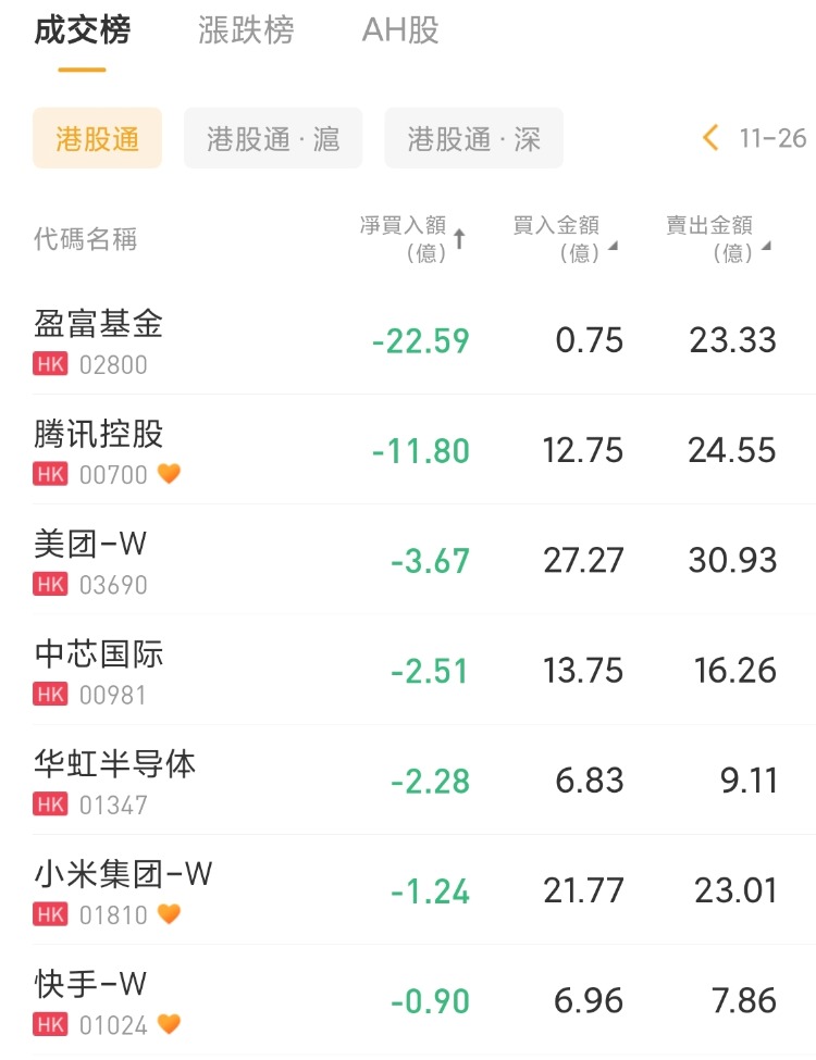 盈富基金、腾讯控股、美团-W分别遭净卖出22.59亿港元、11.8亿港元、3.67港元。