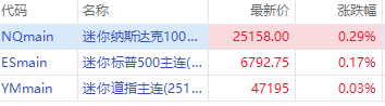 周三盘前,三大股指期货盘前齐涨,截至发稿,纳指期货 $NQmain 涨0.29%,标普500期货 $ESmain 涨0.17%,道指期货 $YMmain 涨0.03%。