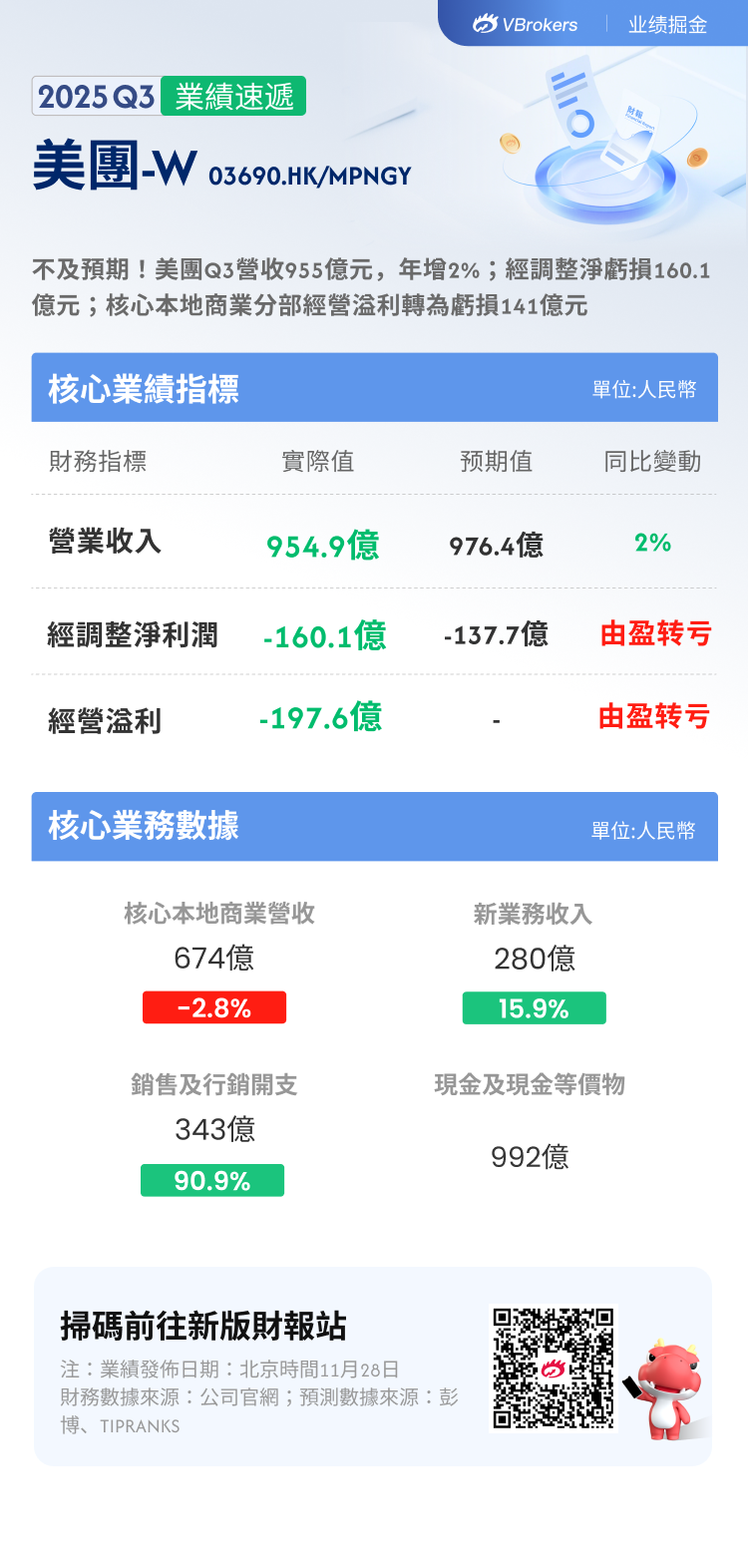华盛资讯11月27日讯,美团-W( $03690.HK )今日公布截至2025年9月30日止的Q3业绩。
