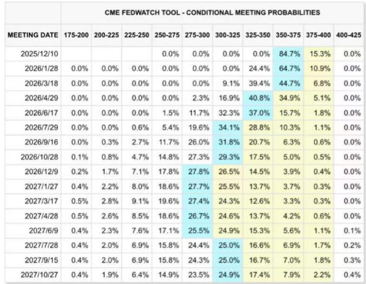 华盛资讯11月27日讯,美联储降息概率持续提升!周三,在美联储发布最新经济《褐皮书》、两位官员发表支持降息言论后,市场进一步押注12月降息。据CME“美联储观察”,美联储12月降息25个基点的概率已升至84.7%,维持利率不变的概率为15.3%。