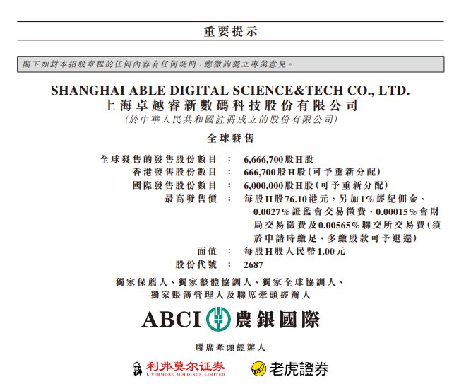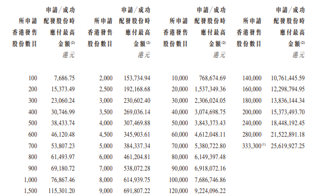 - 发售价格:每股发售价62.26港元-76.10港元,每手100股H股,一手入场费为7686.75港元。