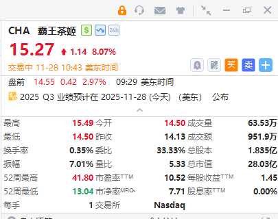 华盛资讯11月28日讯,中概业绩股走势分化,霸王茶姬大涨超8%,海外GMV同比涨超75%;