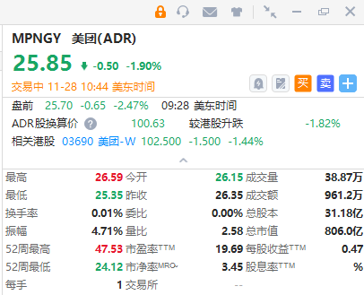 美团ADR跌约2%,近三年来首次季度亏损,核心本地商业Q3巨亏141亿元,预计Q4延续经营亏损。