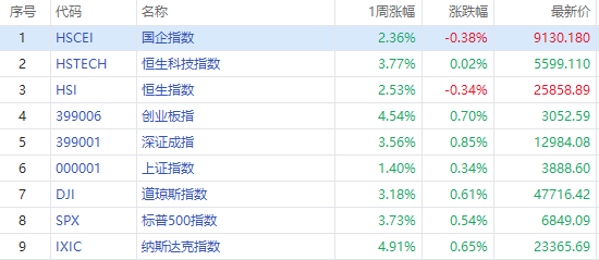 港股方面,本周恒生指数涨2.53%,报25858.89点;恒生科技指数涨3.77%,报5599.11点;国企指数涨2.36%,报9130.18点;