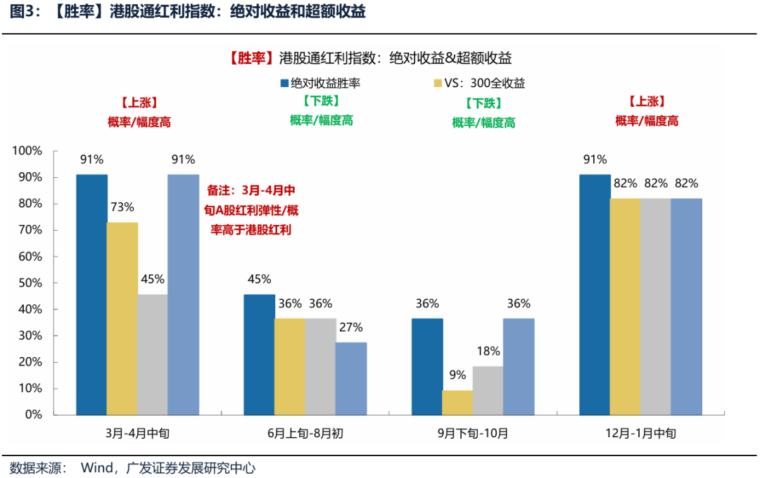 (1)【上涨】概率较大/幅度较高:3月-4月中旬,可能是年报高峰,超预期的分红方案导致的上涨,但弹性以及上涨概率不如A股红利。