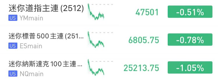 美股三大指数期货盘前走低,纳指期货 $NQmain 跌逾1%,标普500期货 $ESmain 跌0.78%,道指期货 $YMmain 跌0.51%。