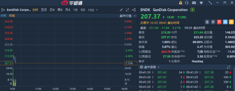 华盛资讯12月1日讯,美股存储概念股早盘加速下跌,Sandisk $SNDK 跌逾7%,希捷科技、西部数据均跌超2%。