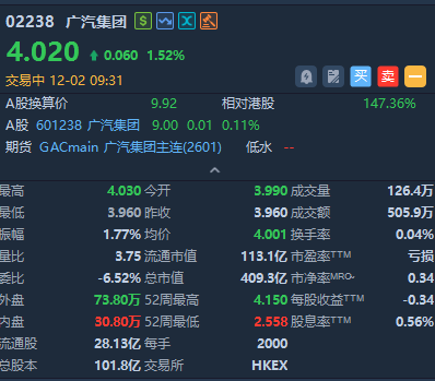华盛资讯12月2日讯,汽车股盘初走势分化,广汽集团涨近2%,比亚迪股份涨超1%,蔚来跌超6%,理想、零跑、小鹏跌超1%。