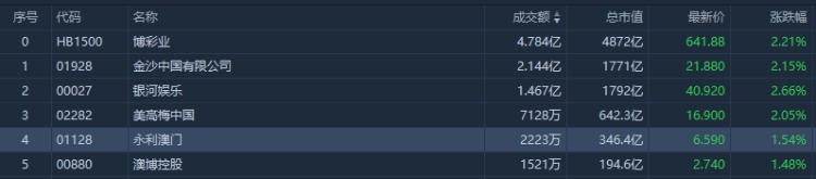 华盛资讯12月2日讯,港股博彩股集体走高,截至发稿,金沙中国、银河娱乐、美高梅中国涨超2%,永利澳门涨超1%。